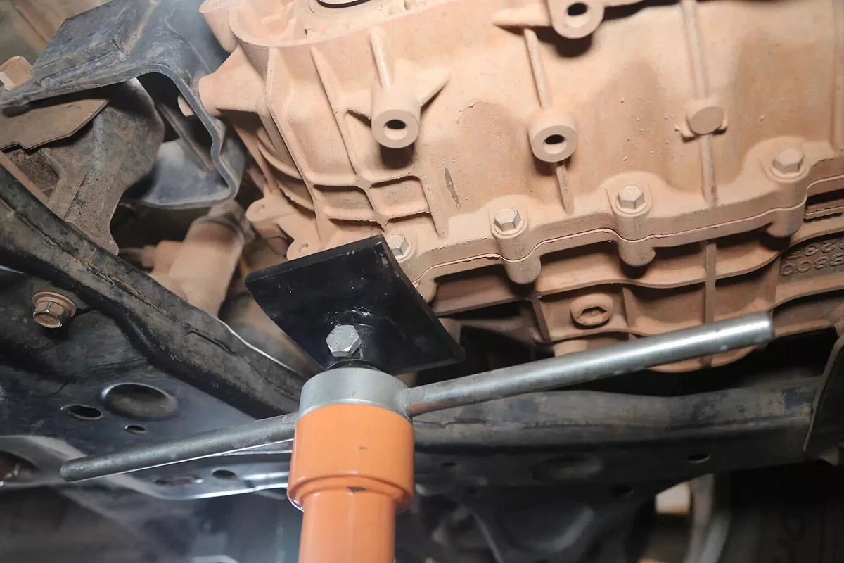 На нашето демонстрационно превозно средство има опорни прорези, които заключват стойката в скобата за монтиране на трансмисията. Трябваше да приложим допълнително повдигане, за да освободим монтажа.