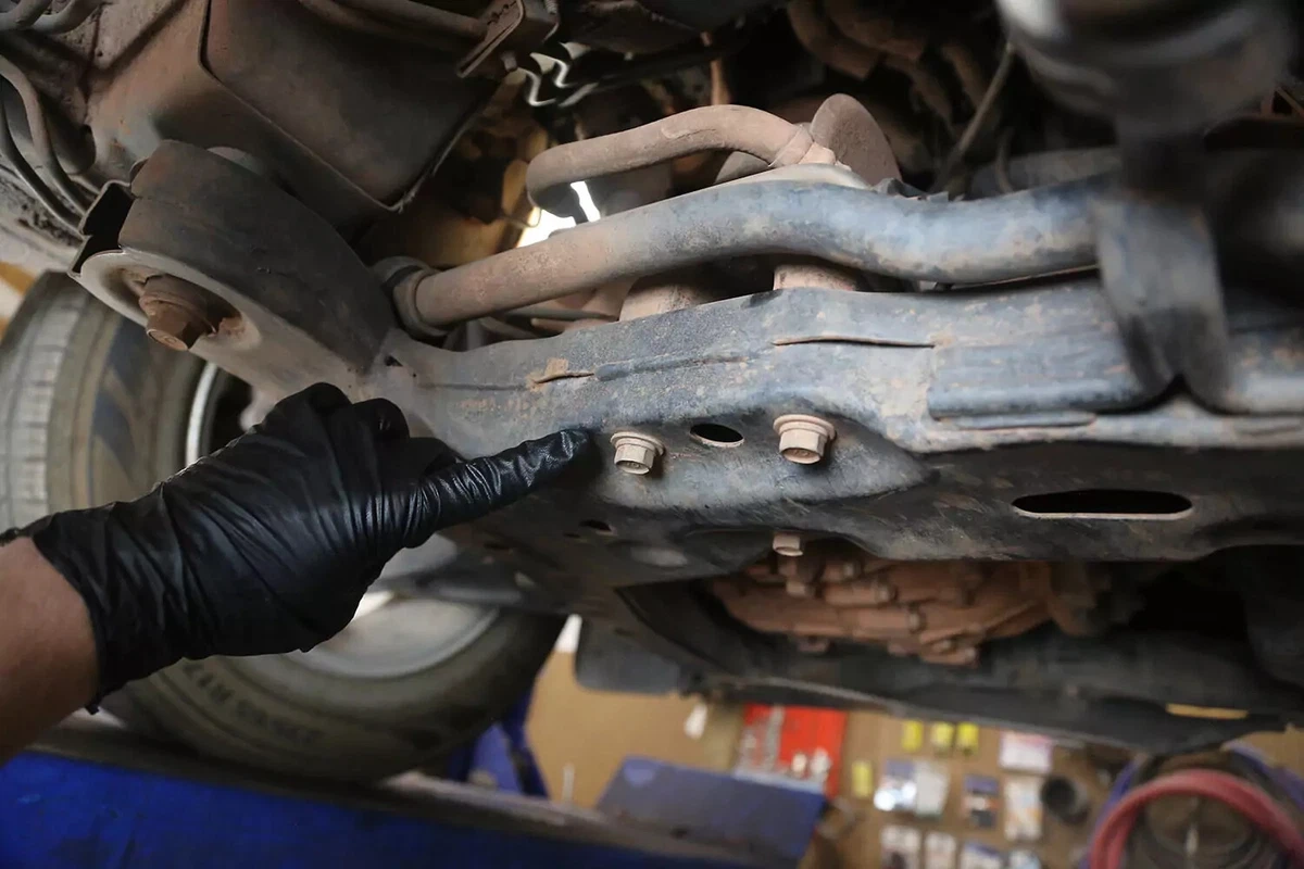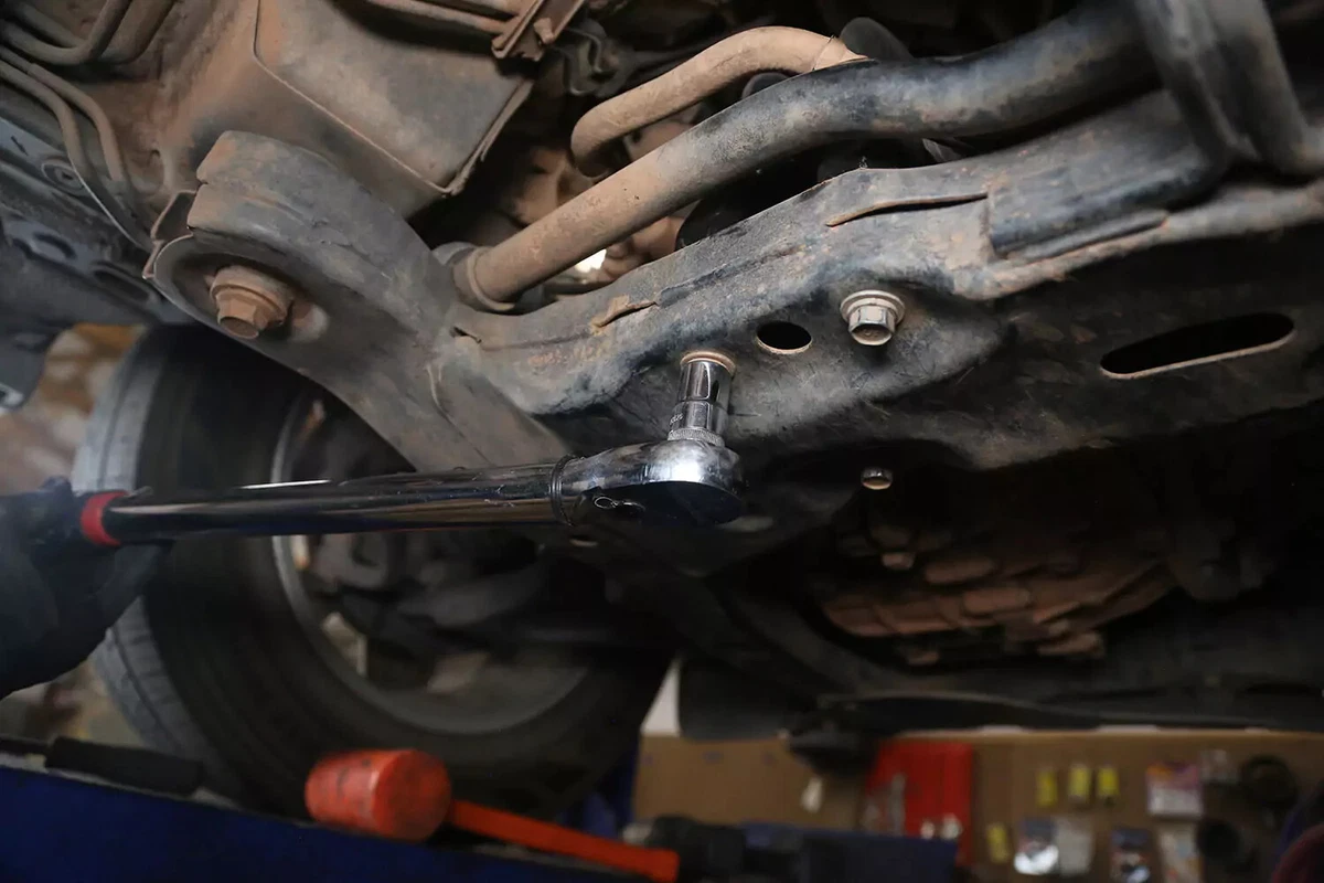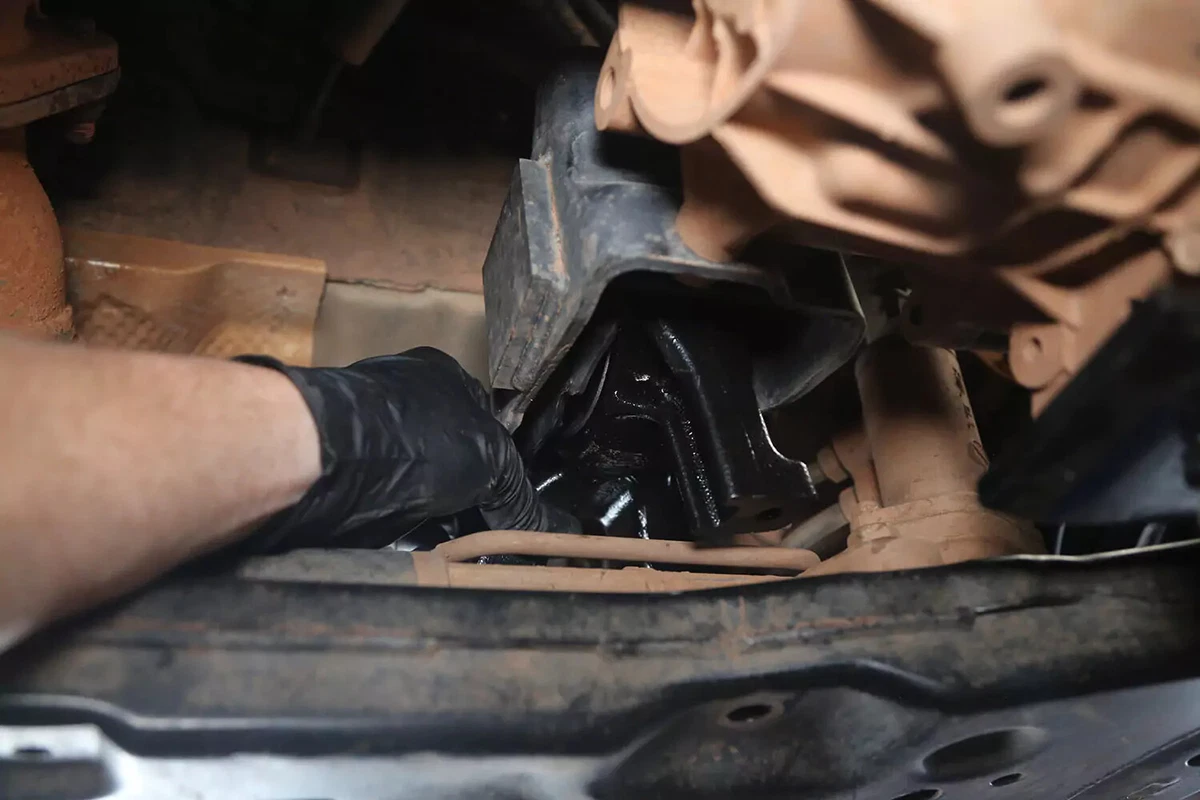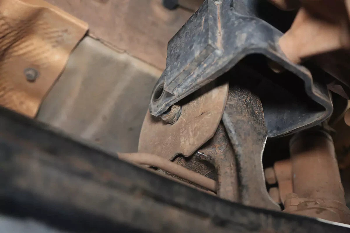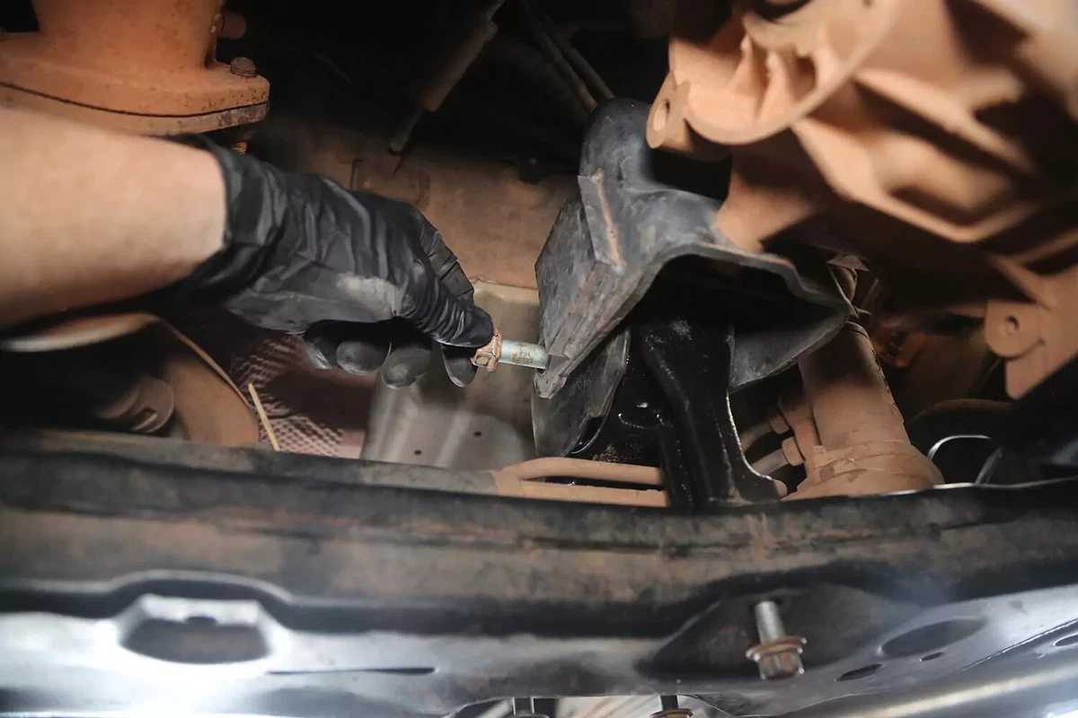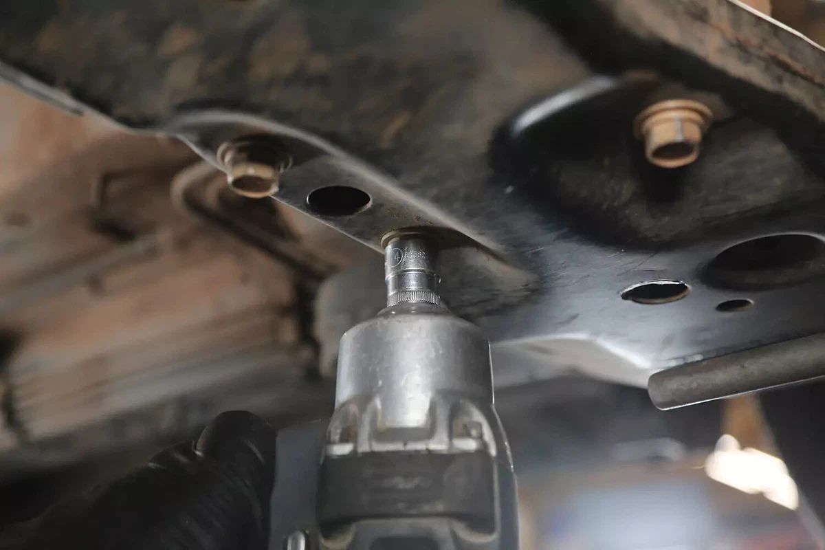 За нашето демонстрационно превозно средство стойката има три болта на подрамката и един болт към трансмисията. Още четири болта прикрепят скобата за монтиране на трансмисията към трансмисията. При повечето превозни средства те не трябва да се премахват.